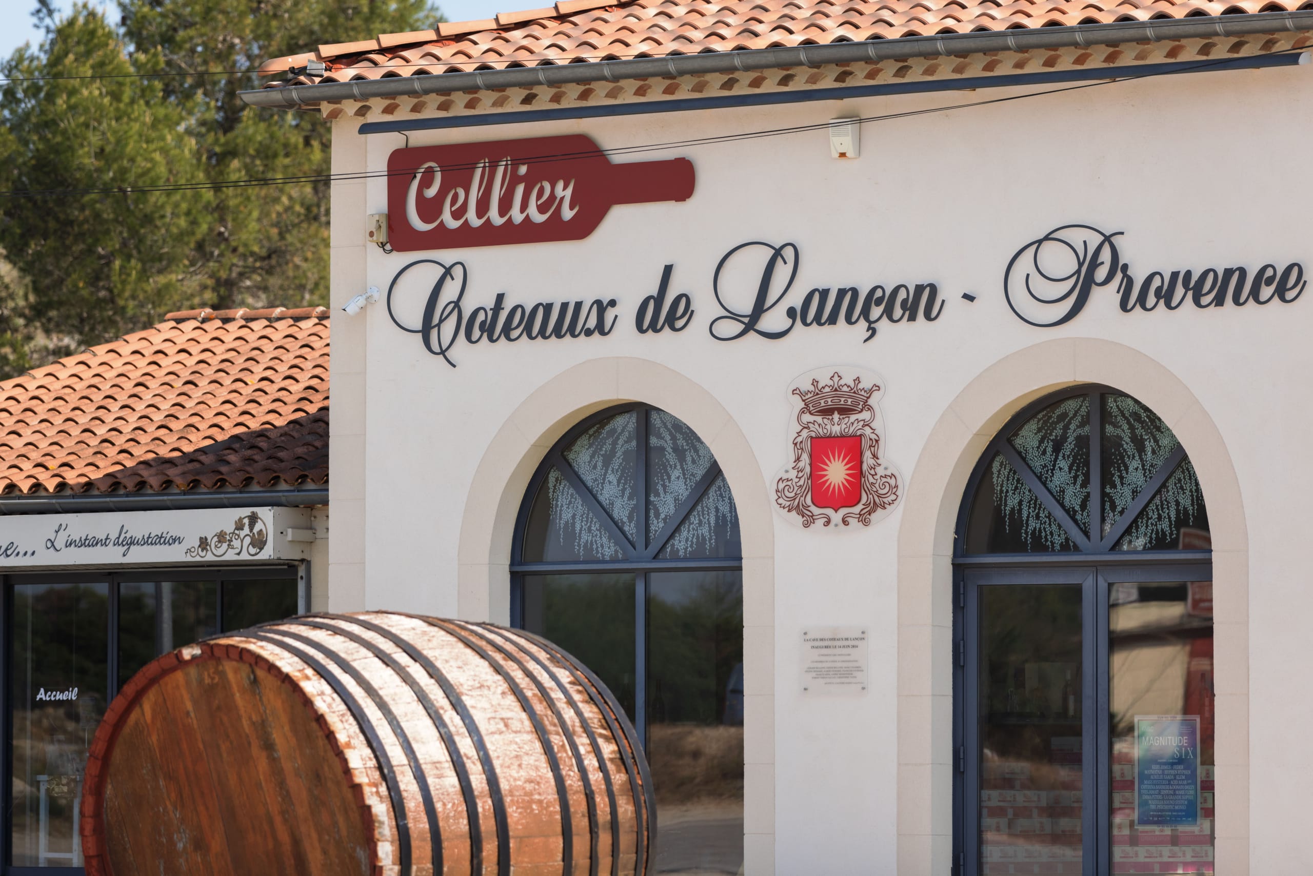 Facilement identifiable par son blason avec un grand soleil rouge en son centre, la cave coopérative de Lançon-Provence se distingue de bien des manières. Fondée en 1929, elle est installée, depuis 2014, dans ce bâtiment entièrement dédié à la découverte de ses vins. Ces derniers sont produits grâce à quinze coopérateurs dont les raisins sont ensuite transformés dans les règles de l’art. On est ici comme chez un caviste.